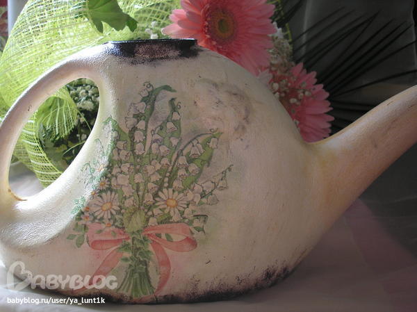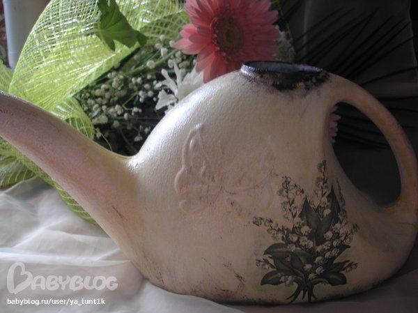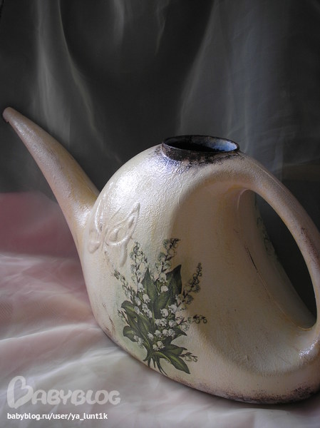 Честно не знаю выкладывать работу или нет....Я знаю,что я могу тут больше. И наверное я не оправдала надежды тех девочкек,которым нравились мои работы. Во-первых,работа сделана сегодня ночью.....И меня как обычно не устраивает результат.Ну не тоооооо....Потому что вообще идея была другая. И лейка тоже. Я железную искала. Во-вторых,мама забрала хороший фотоаппарат. У старого снимки значительно хуже.