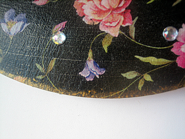 ой тяжело же мне дался этот урок. По мимо того, что я испортила тарелку уже готовую, как то не получился у меня шеллак +гуммиарабик, ну да ладно!!! ход работы. Загрунтовала поверхность, после высыхания зашкурила, наклеила мотив, просушила покрыла несколькими слоями лака, прошкурила, а потом началось на каком то сайте прочитала что 2 шаговый кракле можно сделать при помощи одношагового, но у меня сразу не получалось, как то трещинки не получались вообще, после 4 попытки я увидела, что начали появляться трещинки минут через 40-50, после полного высыхания кракле-лака.ю я затерла эти трещинки, к сожалению выла возможность только тенями, поэтому их почти не видно-кракленки., покрыла сверху лаком их аэрозоля приклеила стразинки