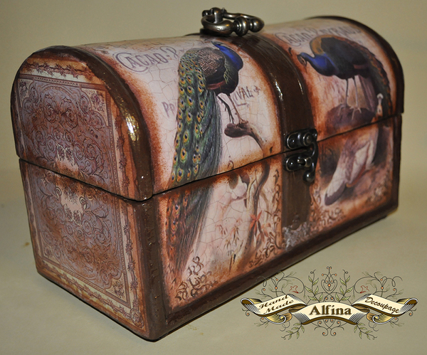 Материалы: Сундучок, шпатлевка, распечатки, акриловые краски, акриловый лак, 2-шаговый кракелюр, фурнитура (ручка-кольцо, ножки), патина.