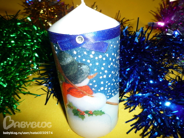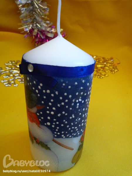 Вырезала из салфетки полоски нужного размера; взяла бумагу для выпекания, обернула свечку салфеткой, сверху бумагой, грела этот "бутерброд" феном сначала с одной стороны, потом дала остыть, затем с другой стороны, опять дала остыть. онтуром сделала имитацию снега. Добавила ленточку и стразик.