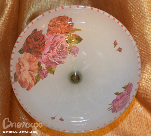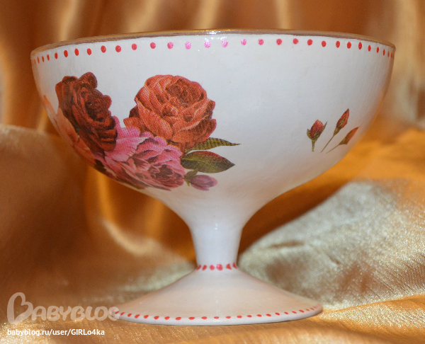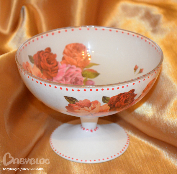 Обезжирила, наклеила мотив декупажным клеем, контуром сделала тички по краю, покрыла грунтом причпокиванием, после высыхания краской причпокиванием, после высыхания еще раз покрыла краской,т.к. были просветы, но уже кистью, пошкрурила, опять покрыла краской, снова шкурка, лак, шкурка, лак, прямой декупаж(вырезала мотив, сбрызнула лаком для волос и приклеила декупажным клеем), контуром опять сдела точки по краям. Покрыла лаком, шкурка, лак, шкурка, лак, после высыхания еще слой лака.