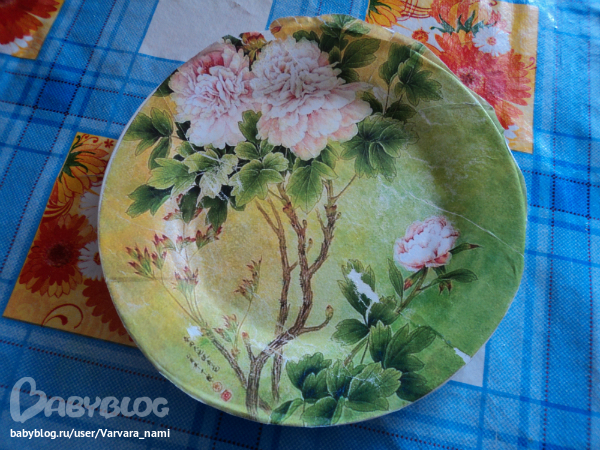 -попробовала приклеить то что есть, не все разрезики получились верными, так как тарелка сложная(много граней) где то в нахлест, где то проплеши вышли(((