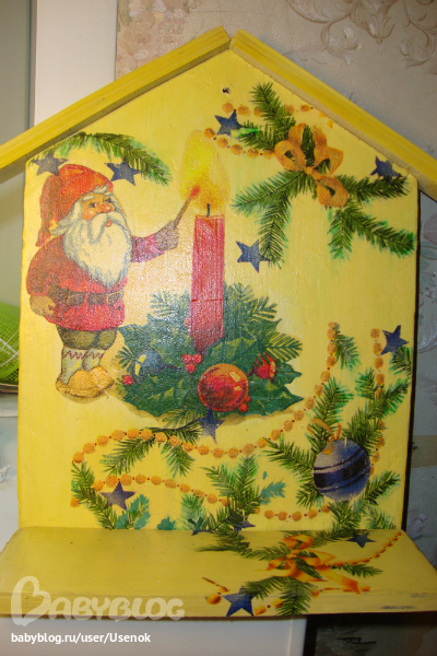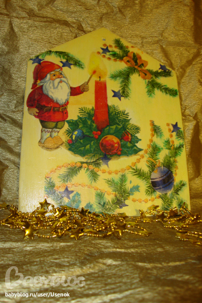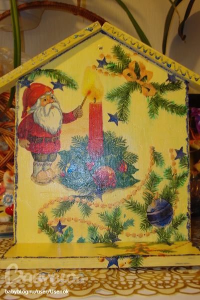 По работе скажу - 1. гномик "повис" со всей композицией - не удачно очень. 2. Слева внизу мотив явно виден край-срез салфетки - незаконченый фрагмент. 3. Фон - вообще не в тему - желтый яркий - зачем?