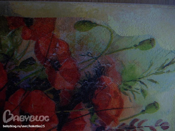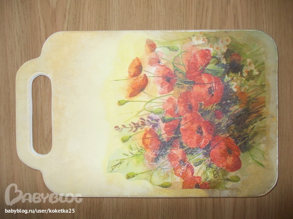 Мак наполовину оборван, это край салфетки, я собиралась дорисовывать. Я подняла выше, потому что, тогда остаётся половина доски пустой, край доски тоже дорисовывать под мотив. Мне что нужно и естественные края салфетки обрывать? Ведь я вырезала мотив только сверху и справа.