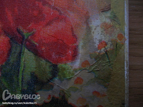 Посоветуйте! (обсуждаем черновые работы)На первый взгляд кажется так просто, приклеить салфетку. Первая потытка с файлом не удолась, салфетка в некоторых местах порваласт и разошлась, пришлост отклеить. Вторая попытка была удачней. Салфетку клеила при помощи кисточки и воды. Но...в том месте где у салфетки узорчатый край дырочками, она разошлась