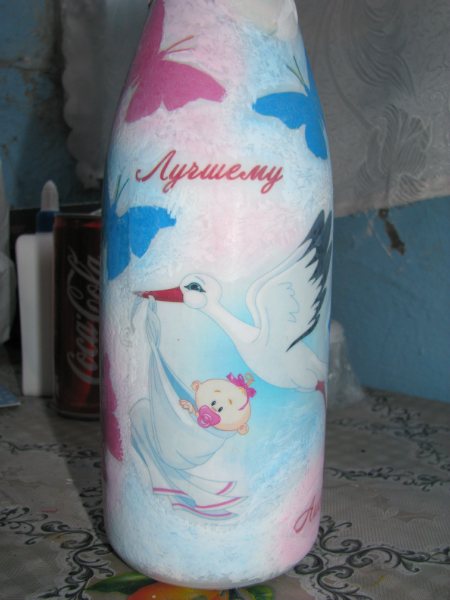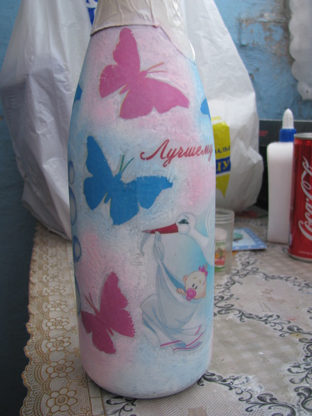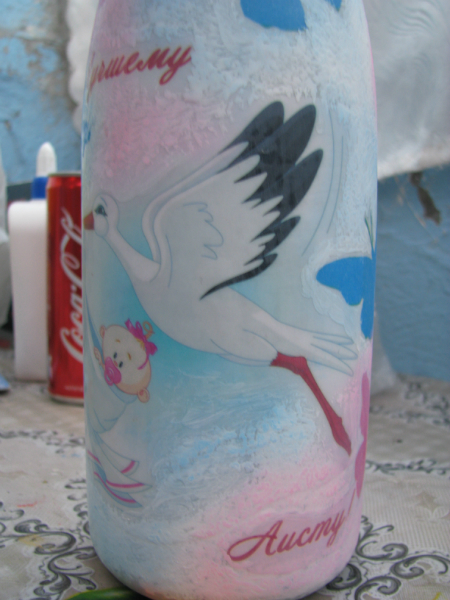 тогда пастелью лучше там где переходы смягчи, посмотри, потом надо красиво обыграть бабочек, стразиками всякими, 3д гелем, горло украсить лентами, можно соску прицепить на ленту и на горло едеть, у меня посмотри на моей странице, где фотоальбом есть пример с бутылкой и соской