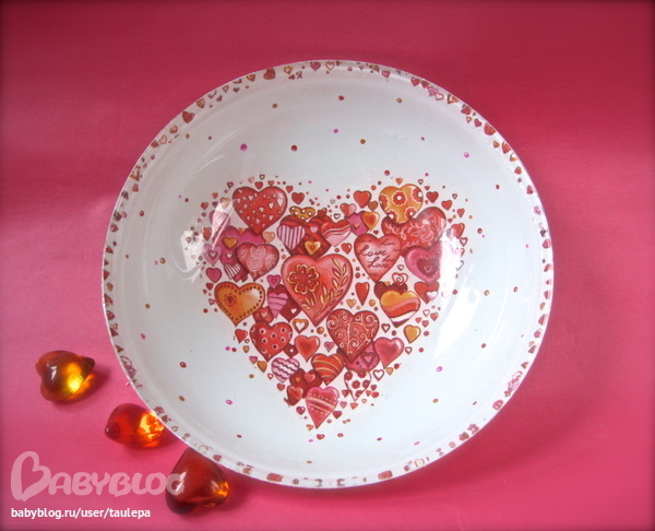 Вырезала из салфетки окантовку наклеила на край тарелки. Приклеила сам мотив.