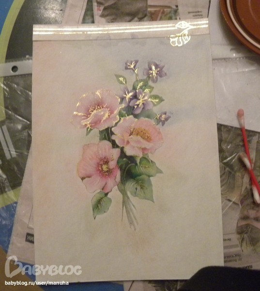 Ход работы: прогрунтовала. Покрасила белым акрилом. Наклеила мотив, подрисовала то что оторвалось. И нанесла дымку ватной палочкой.