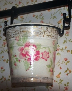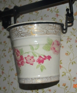 золото, плайлдовский медиум, белая краска. Делалось в разное время, трещинки внизу получились мельче. т.к. дно значительно уже раница в размере трещин смотрится хорошо. Салфетка, лак в спрее. Предполагается как кашпо для розы, все руки не доходят пересадить.