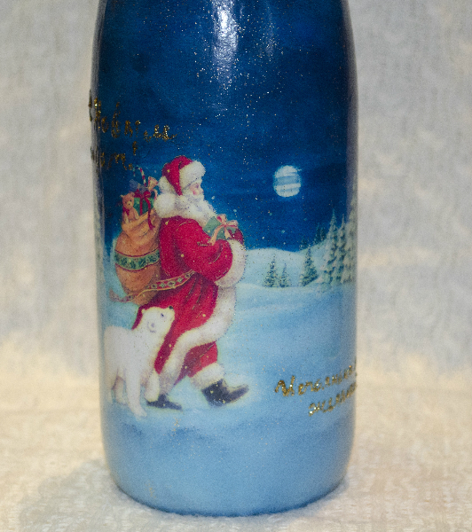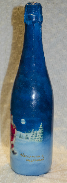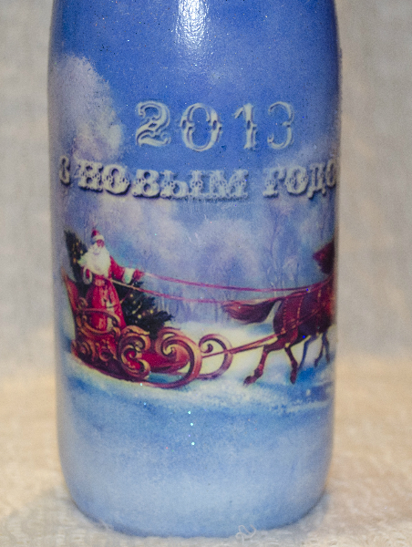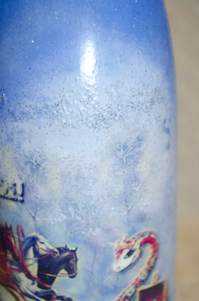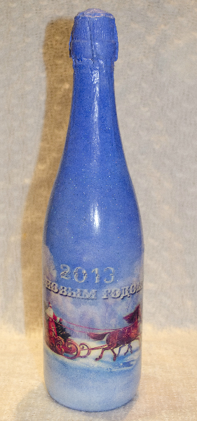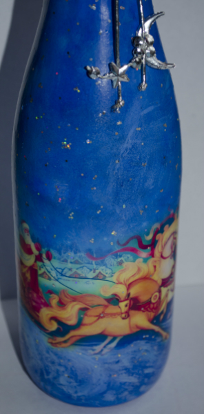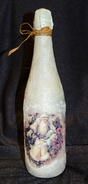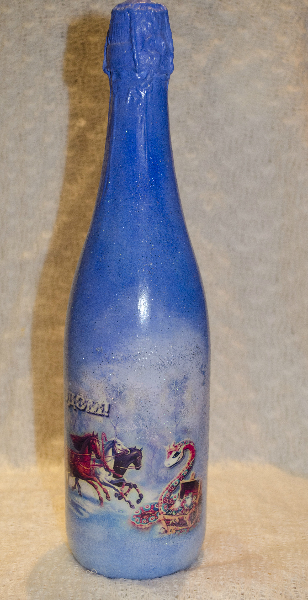 в работе использованы материалы:распечатки, краски акриловые, лак глянцевый, лак матовый Поли Р, глитер,манка (на последней фото видно), шпаклевка и кружево(вторая бутылка),контур.