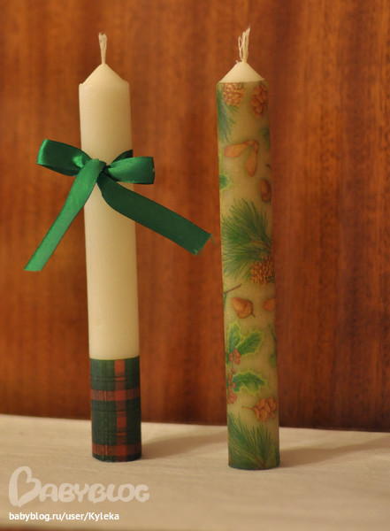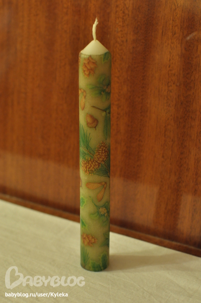 Вик, жги их на подставочке! Приглядывая! Тонкие свечи коварны, довольно сильный огонь рядом с мотивом. И если даже он хорошо пропитался парафином, все равно может воспламениться. Я делала такие к прошлому НГ, и на столе еле скатерть спасли