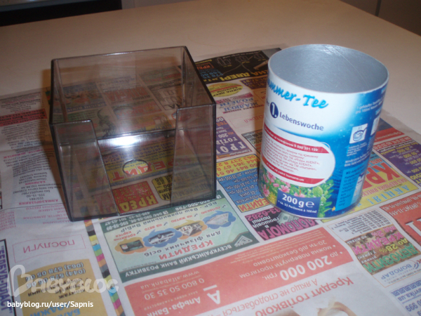 - появилась идея что-то сделать с подставкой для блока листиков, но не делать же его один - скучать будет - просился стаканчик для канцтоваров. Тут пригодилась коробочка из-под детского чая, которую я забывала выбросить =)