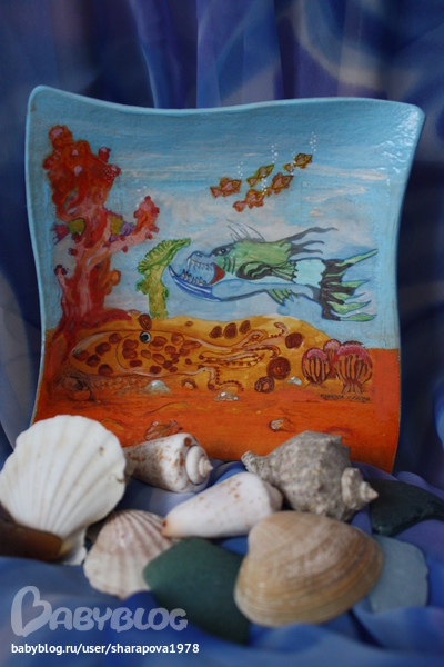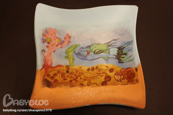 Покрыла всю тарелку лаком в 15 слоев, шкурила через каждые 3 слоя. Так много слоев лака пришлось делать потому, что окантовка рисунка на лицевой стороне тарелки получилась толстой, и чтобы выровнять плоскость я лачила-шкурила-лачила и т.д.