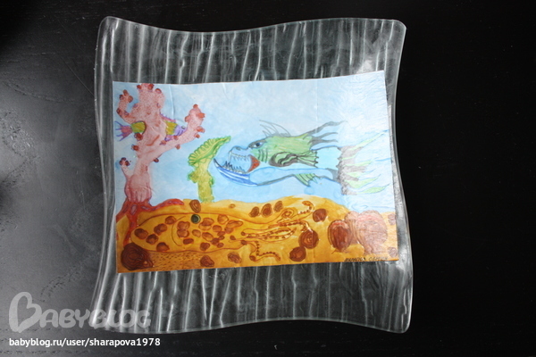 Тарелку обезжирила и покрыла клеем ПВА, приложила мотив, приклеила.
