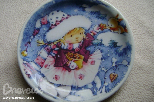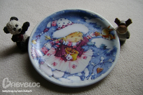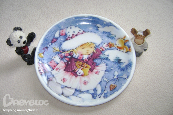 Ход работы: распечатала картинку, покрыла тремя слоями лаком для декупажа (или паркетным, я забыла!!!), вырезала нужного размера картинку, замочила (держала не 15-20 минут, а минут 30, верхняя пленочка снялась просто великолепно), сделала надрезы на картинке, обезжирила поверхность тарелки, намазала клеем для декупажа, разложила распечатку, разгладила валиком, заложила складки, просушила. Зашкурила швы (шкурила, пока на ощупь не стала их ощущать). Дальше "замаскировала" швы, где они были видны. Просушила.Губкой прошлась по краю тарелки (изначально был голубой край, но мне не понравилось, темный я не хотела бы) белой краской. Покрыла 10 слоями лаком для декупажа, как было показано в уроке - после каждого третьего слоя шкурила. Работать было очень интересно.