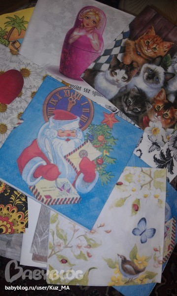 Мне декупажные штучки: разнообразные салфетки, заготовки (УРАААА!!) и книгу для записей рецептов (я очень люблю готовить, но такой книгой пока не обзавелась).