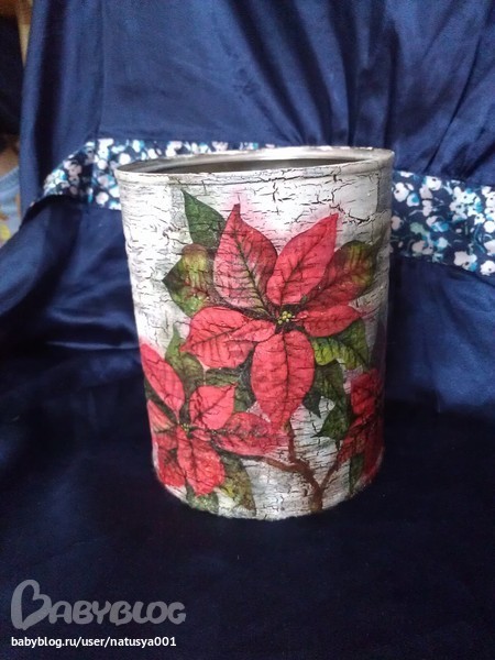 ход работы: банку прогрунтовала, покрыла коричневой краской, нанесла кракелюр, после высыхания покрыла белой краской, приклеила салфетку, покрыла лаком, сделала тени пастелью.