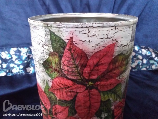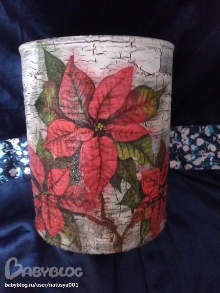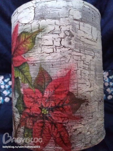 Такой славный кракелюр! Не равномерный, но все на месте. И пуасентия так хорошо села! Интересно, какое применение для баночки придумала автор?