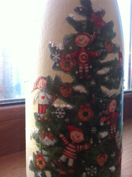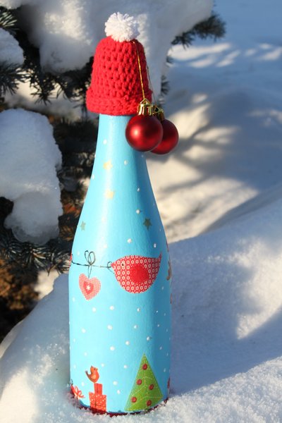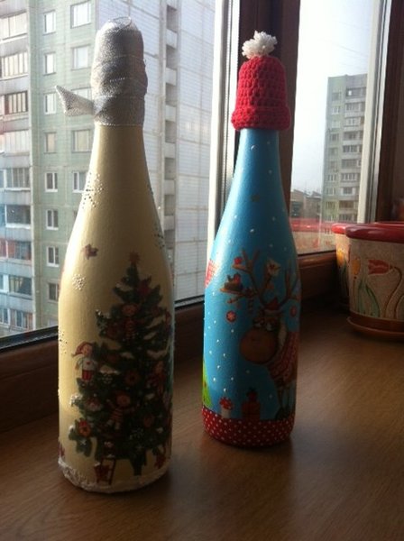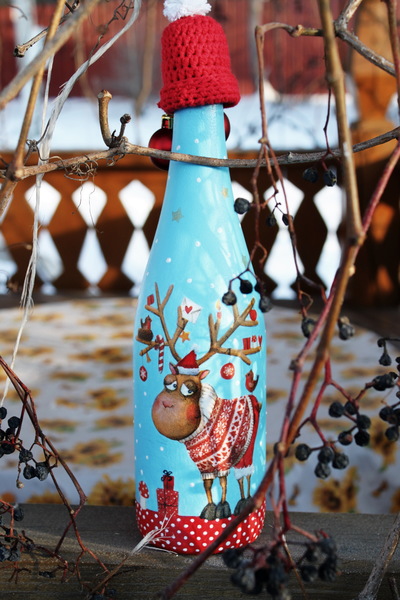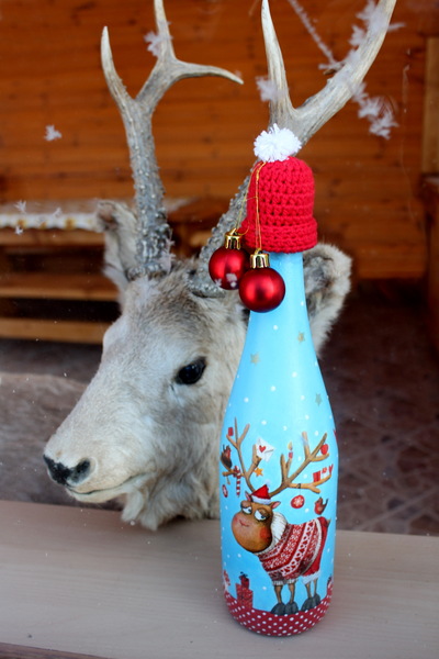 Замечательные бутылки!! Поднимают настроение, хочется улыбаться. Олень и шапочка связанная меня потрясли!! Молодец!!