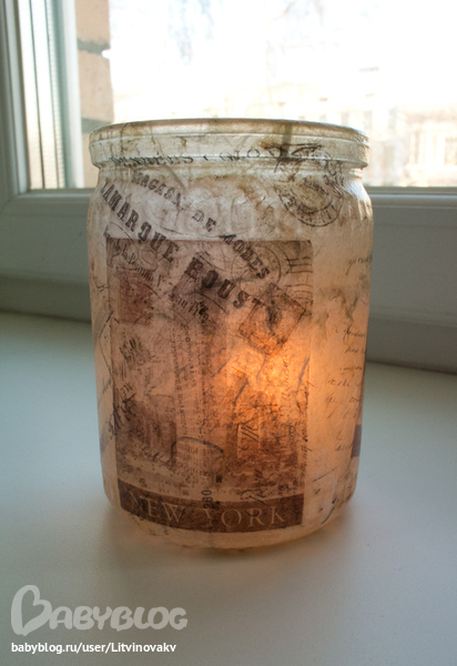 банку отмыла от этикетки и обезжирила спиртом, взяла две разных рисовых бумаги похожих друг на друга по тематике. Из одной получился фон (рвала на крупные куски), из второй вырезала марки с городами. Сначала на ПВА с водой наклеила фон, просушила, зашкурила, затем поверх фона приклеила вырезанные города, еще раз просушила, прошлась шкуркой для гладкости и покрыла банку двумя слоями лака.