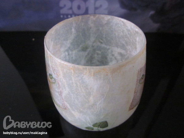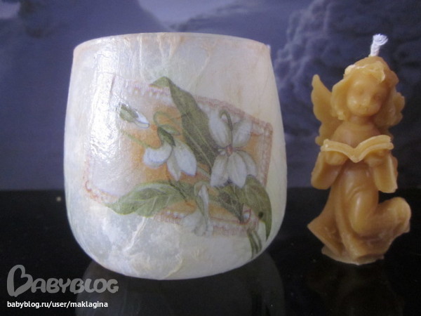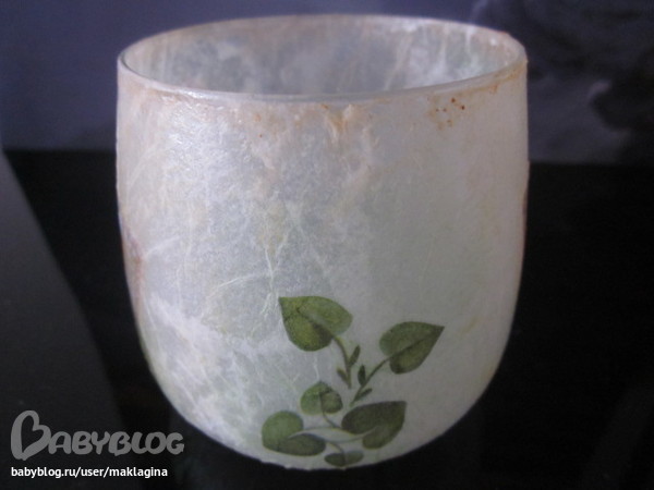 стеклянный подсвешник оклеила рваными кусочками белой салфетки в нахлест 3-5мл. Сделала два слоя. Получавшиеся складочки не разглаживала. Просушила. Покрыла клеем .Фрагменты рисовой бумаги пробовала вырывать, но на изделии оказалось слишком видно. Пришлось вырезать. Приклеила на клей.Красками с разбавителем сделала тени Все покрыла лаком.