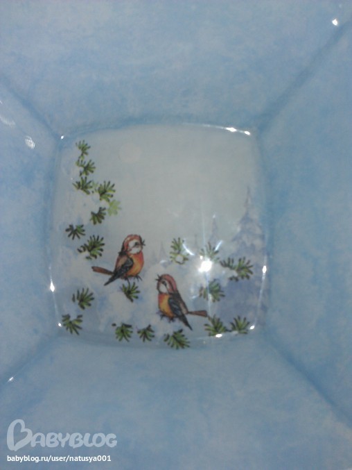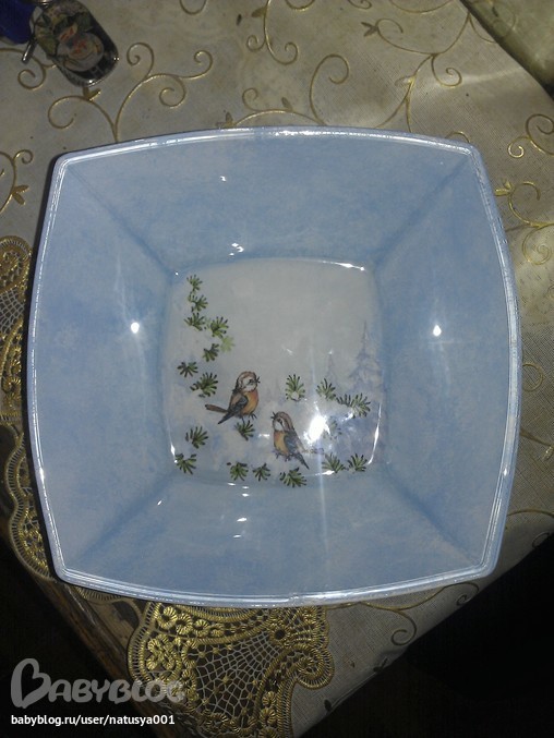 ход работы: салатник обезжирила, приклеила салфетку, покрыла лаком затем белой акриловой краской, с помощью пакета прочпокала сначала голубым затем белым цветом
