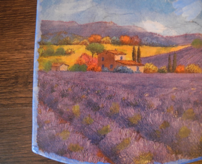 видимо с окантовкой совсем плохо у темя получилось с цветом. Тк салфетка приклеена ровно по доске. У меня салфетка не на всю доску. она закончилась примерно на 1/4 от всей поверхности доски и остальную часть я дорисовала. Может не совсем это получилось удачно, тк я уже писала , что дорисовывать пока мало получается. Возможно нужно было выбрать более простой мотив. Что бы работа краской было меньше.