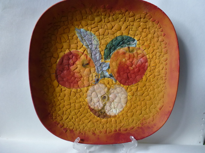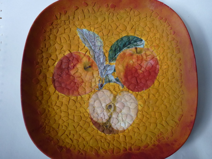 Наташ, очень широкий кант и давит он сильно, прям душит яблоки, разведи краску ту, что у тебя желтым фоном и разбавленной поводи по бордовому, излишки промокни, а потом почти сухой губкой сделай почпокивания опять же желтой этой, надо сравнять цвет, чтобы бордовый проглядывал через напыление