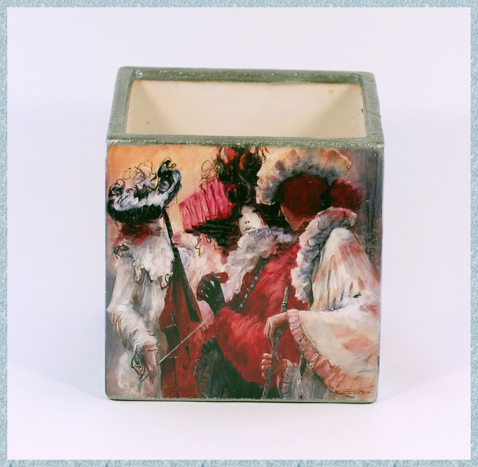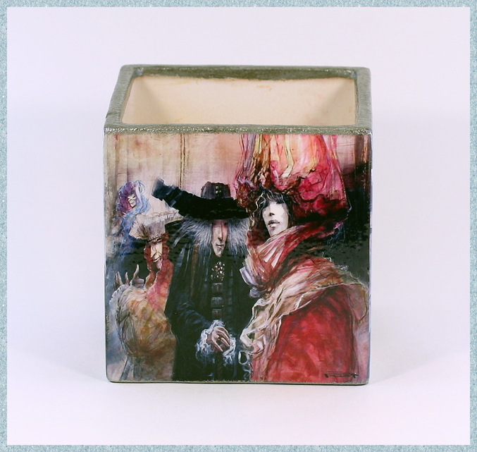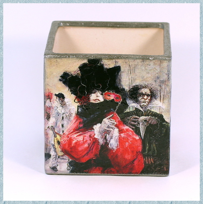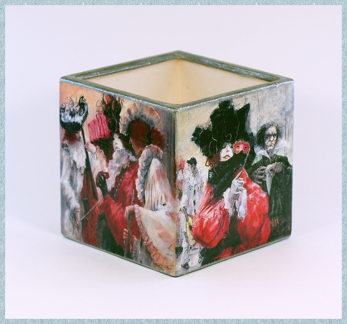 Вазу смыла, зашкурила ,загрунтовала. Сделала 4 распечатки. Наклеила их на 4 стороны. Покрасила донышко и сделала окантовку.