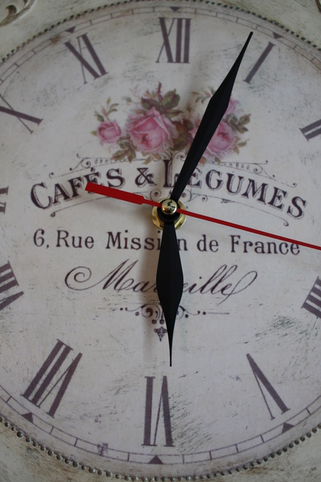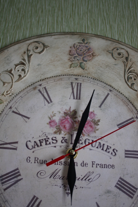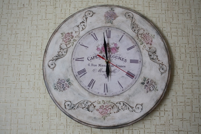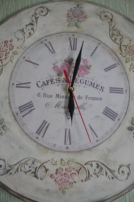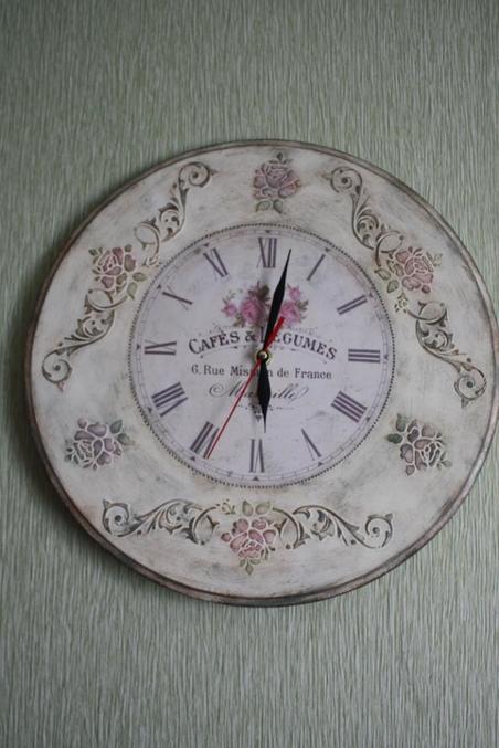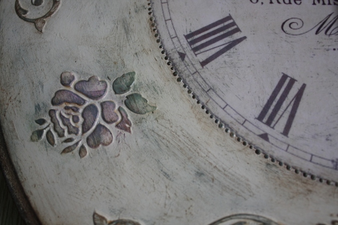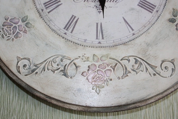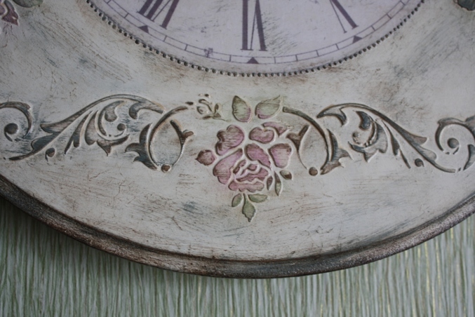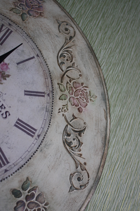 Следующийм этапом было окрашивание всей работы акриловой краской фирмы Plade по номером 988, после высыхание которой я начала наносить акриловую краску разных цветов поверх выступающих частей часов, для создания эффекта многослойного окрашивания. А именно, розы окрасила краской фирмы "Ладога" (цвет темно розовый) смешанную с Plade по номером 988, листья на розах окрасила краской Plade 922 + Plade 988 , а все оставшиеся части окрасила краской смешанной из цветов Plade 988 + Plade 925+ Plade 2381, тем самым получив нужный мне эффект.
