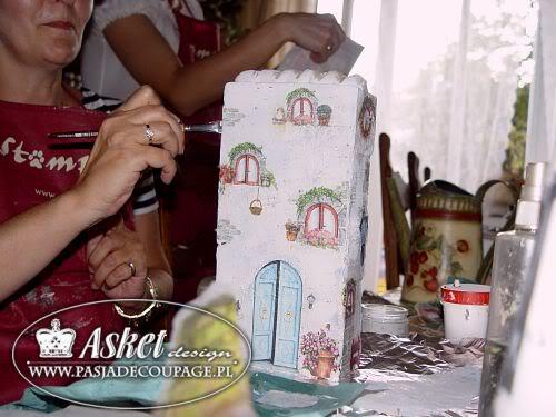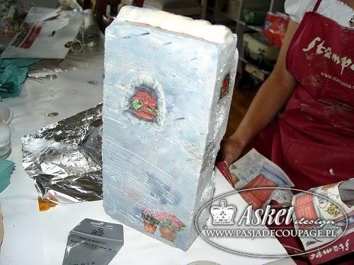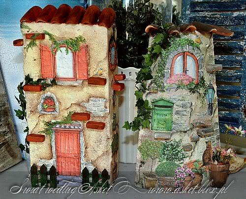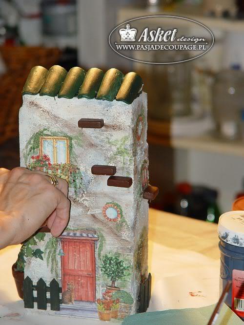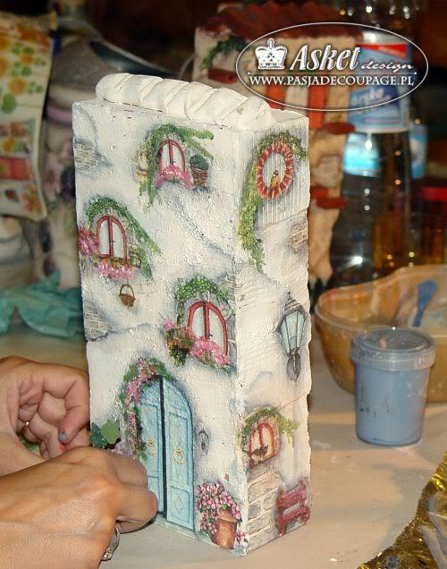 А это фрагменты мастер-класса Аскет. Глядя на них, становится понятно, что сначала кирпич грунтуется, создается текстура, потом на него наклеиваются фрагменты салфеток, из пластики (глины) лепятся декоративные украшения, они приклеиваются вместе с горшочками, заборчиками, покраска, подрисовка и финишный лак.