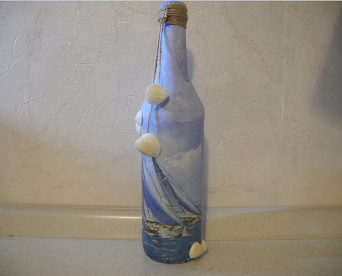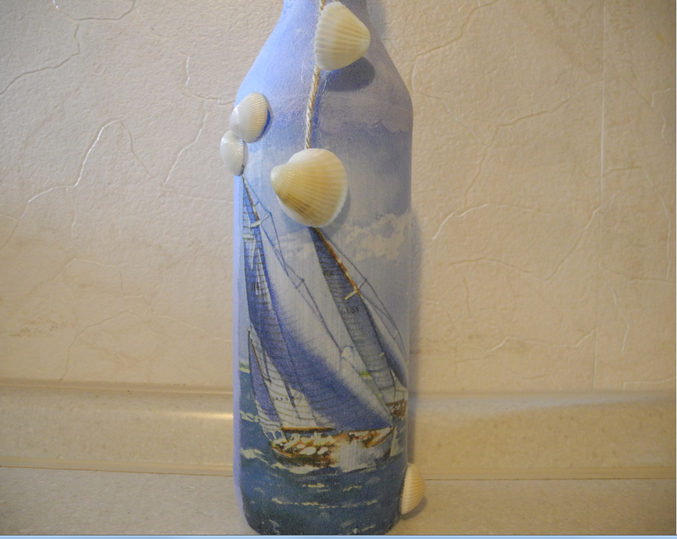 Часть бутылки покрыла синей краской, криклеела ракушки, сделала декор и покрыла слоем лака.