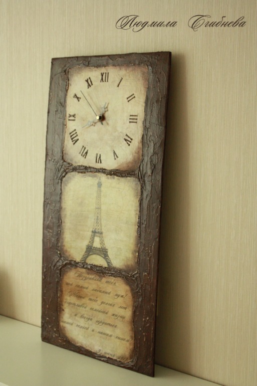 Материалы: деревянная заготовка, распечатки, акр.краски, лак акриловый, шпатлевка по дереву, кракелюрная пара Феррарио, масл.краска, часовой механизм.