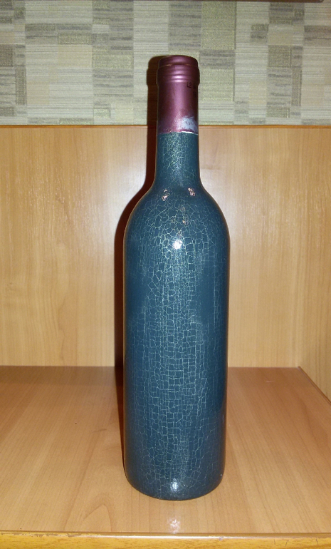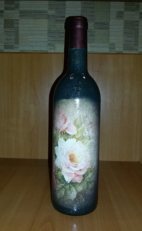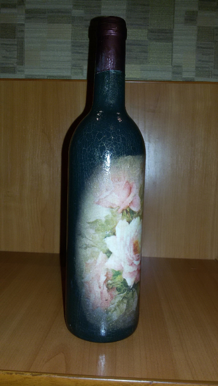1. Бутылка вина в подарок на день рождение. Материалы: бутылка вина, грунт, акриловые краски, декупажная карта, двухшаговый кракеллюр, тени для век для затирки трещин, стекловидный лак.