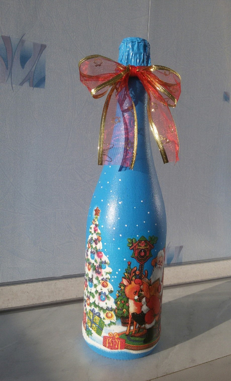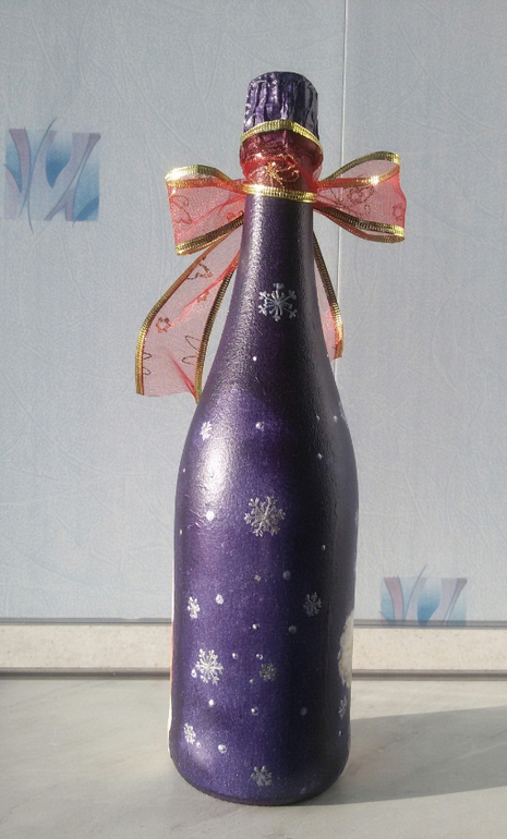 3. Бутылки шампанского в подарок на новый год подругам. Две из них выставляла на конкурс бутылка. Материалы: бутылка, салфетка, грунт универсальный, акриловые краски, акриловый лак, контуры. Бантики оказались не к месту, надо было горлышко сделать более продуманным.