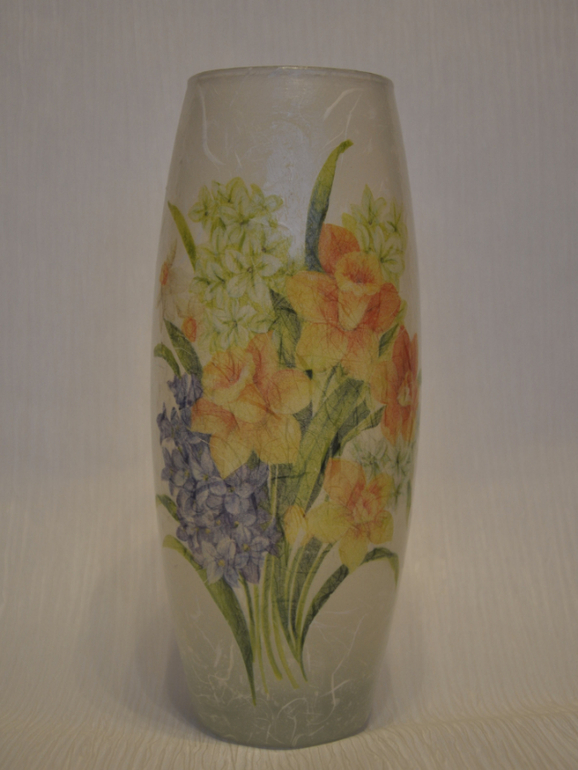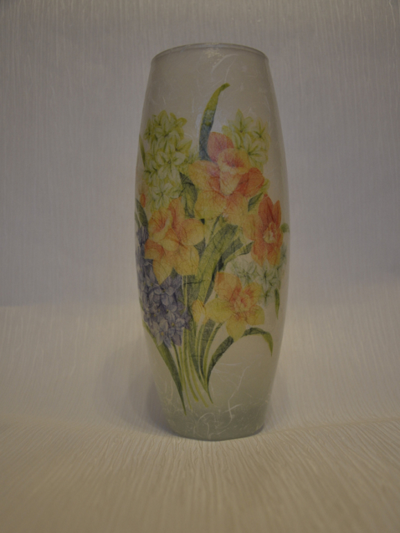 4. Ваза "Нарциссы". Материалы: Ваза стеклянная, рисовая бумага, рисовая карта, клея для декупажа, стекловидный лак.