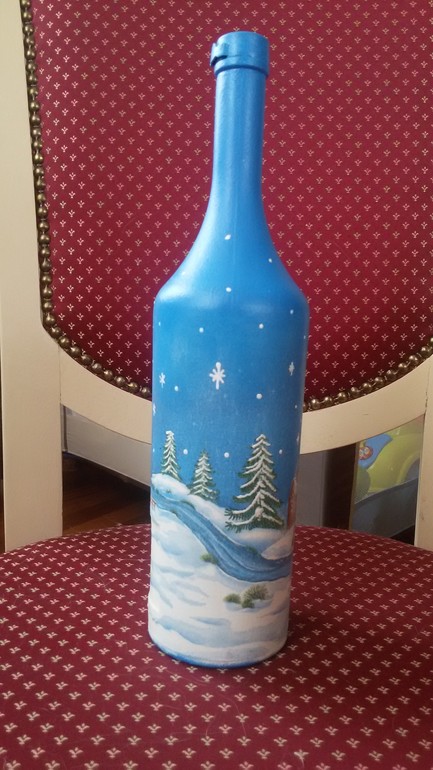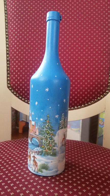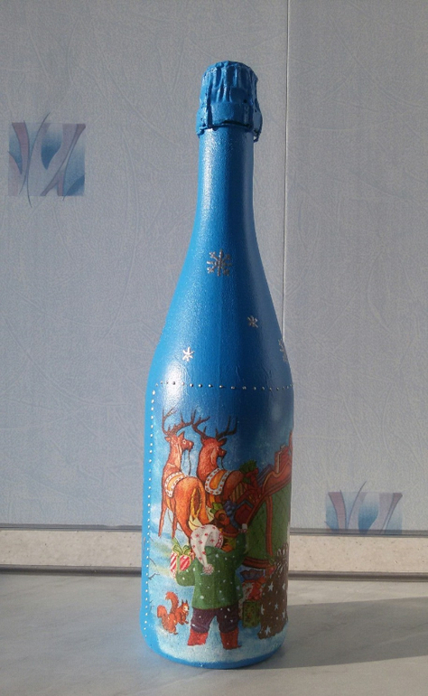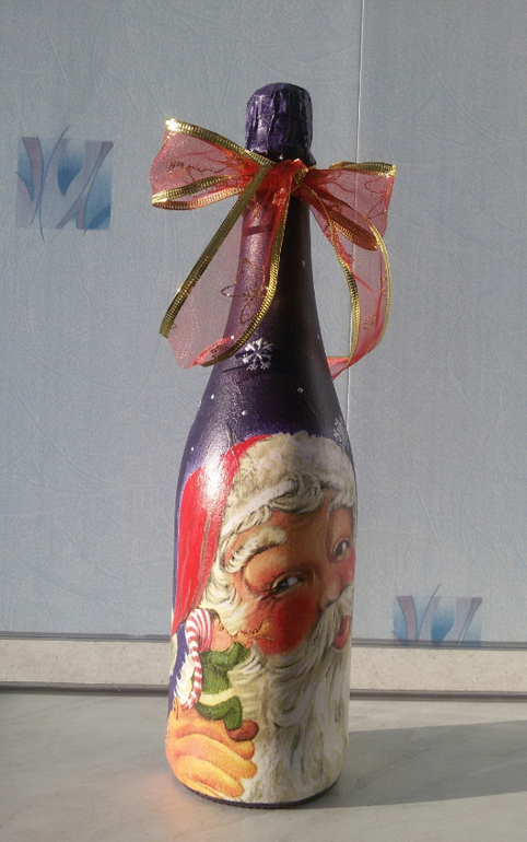 2. Бутылка водки, сделанная для свекра на новый год. Материалы: бутылка, салфетка, грунт универсальный, акриловые краски, акриловый лак, контуры