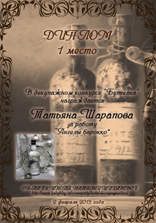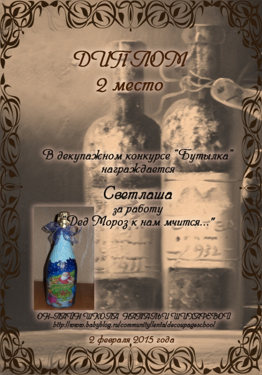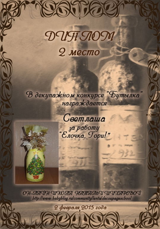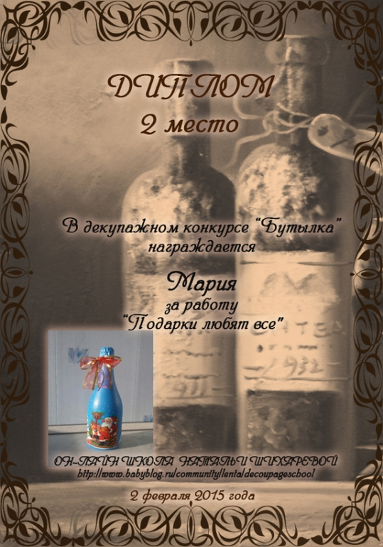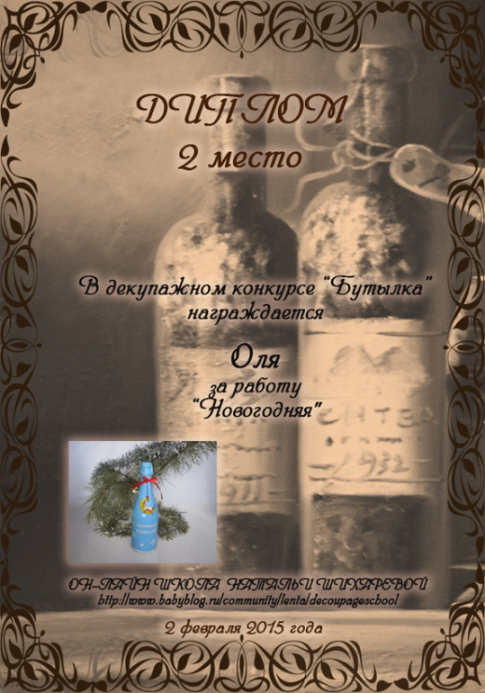 Оля, извините, что так получилось. Просто в посте с результатами ваши работы не были подписаны, а я у Марины похожие бутылочки видела. Вечером исправлю.