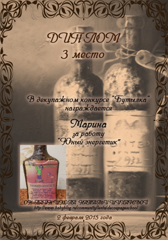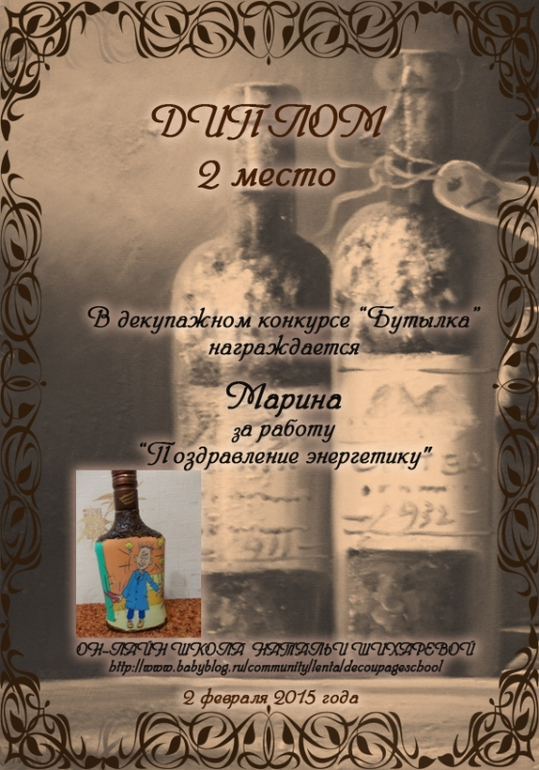 Наташа, извини пожалуйста, ты ошиблась бутылки "Поздравление энергетику" и "Юный энергетик" делала я.ОЛЯ