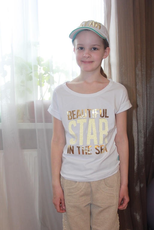 Кепка размер 52-56. Размер головы у дочки около 53 см. Футболка, тоже размер 134.