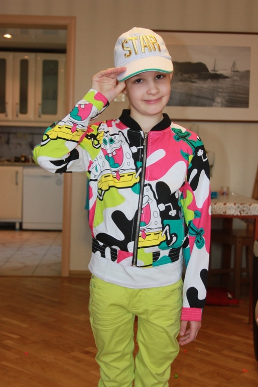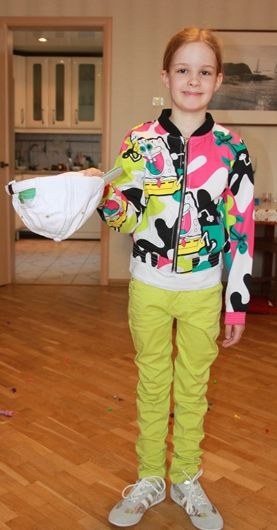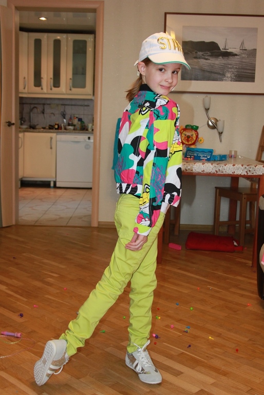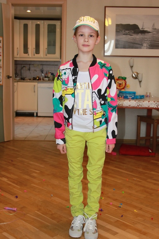 Хвастик на ветровку из коллекции Поп-Арт я уже писала. На рост дочки 132 см. ветровка размером 140 села отлично. Брюки из той же коллекции взяла размер 134. И опять та же история, получился приличный запас. Но думаю, это не критично. Поносим 2 сезона.