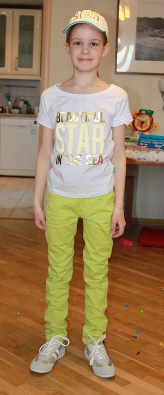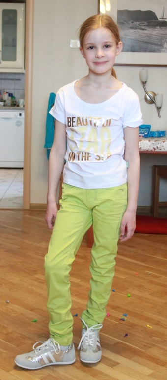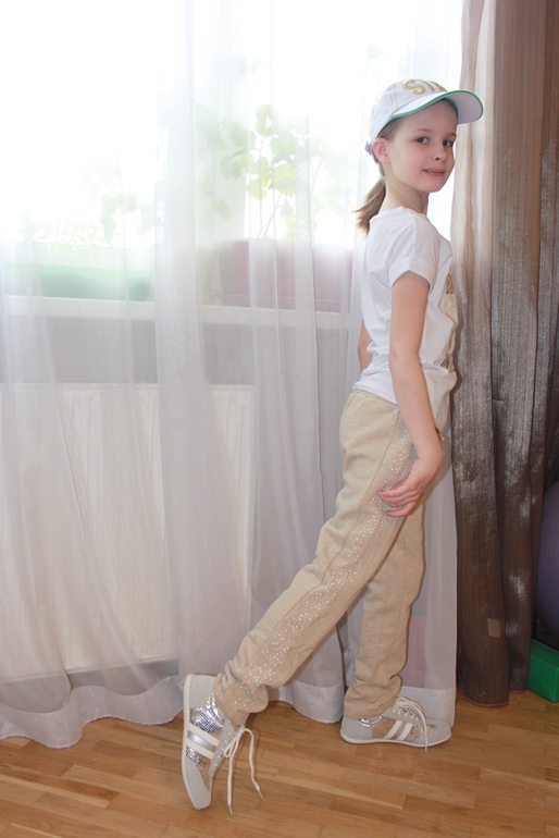 На этом фото особенно хорошо видно, с каким запасиком на нас сели брючки. Кеды, кстати, тоже Гулли. Размер 35. Думаю, что обувь у Гулли идет в размер. Т.к. на наш полный 34 кроссы 35 размера сели с хорошим запасом. Но не критично. носить можно.
