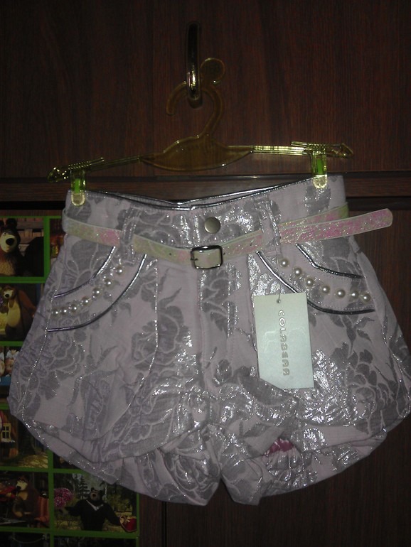 Комплект шикарный,ткань с легким блеском, напоминает парчк, состав 65 хлопок 35 лен.пуговички со стразами и бусинами -жемчужинками- пришивные. Шорты баллон.