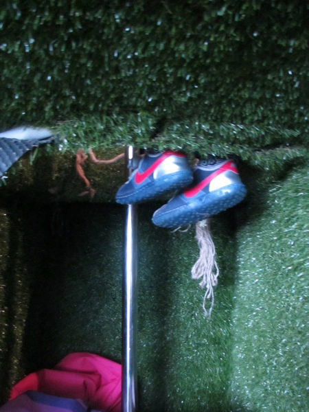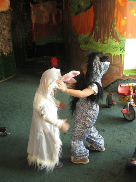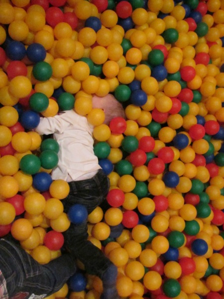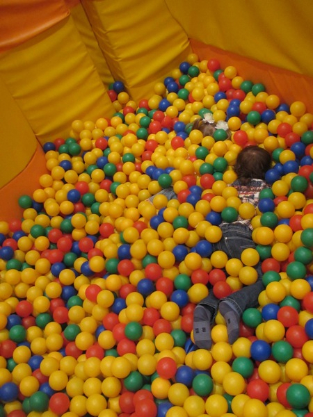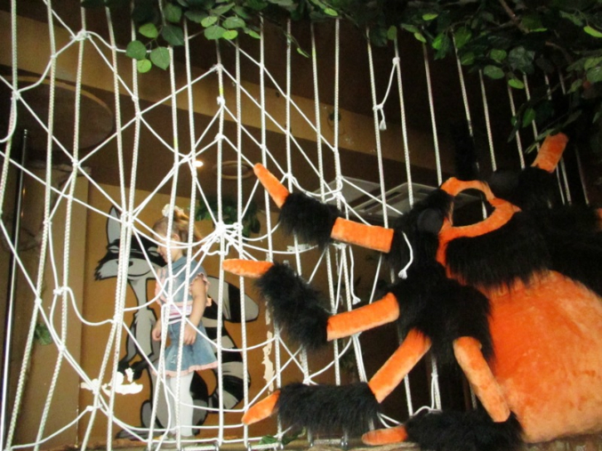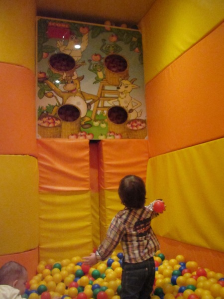 Теперь про саму игровую. Она очень большая, в ней несколько зон: самая клевая - это шариковый бассейн. В троем там нормально было, а вот если детей больше, то станет очень тесно, так что в выходной туда лучше и не ходить. Игровая зона - много игрушек на любой вкус, машинки, велосипеды, куклы, конструкторы, лабиринты и прочее, всего даже и не рассмотрела. Дальше есть такая лазалка: ребенок поднимается по лестнице, а спускается по шесту (как у пожарников в фильме) наши еще ничего, а вот дети помладши падали через это отверстие, ударяясь головой о железный шест. Стилизованна эта область в теме Хэллоуин, пауки, паутина... можно было бы и что-то по радостней.Так вот например остальные зоны в очень светлых, приятных тонах, птички, бабочки, скворечники... Есть зона где стоит доска для рисования мелками, настольный футболл. Еще есть манеж.сть комната для переодеваний. И есть банкетный зал, в который ведет такая малюсенькая дверь. Это для тех кто заказывает торжество у них.
