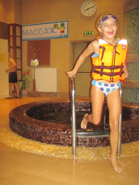 Почему в спас жилете? А по инструкции! Лена там внимательно изучила инструкцию, написано до 14 лет жилеты обязательно! На остальных бассейнах написано то же самое, хорошо она не догадалась там почитать! Кстат, жилет в принципе не мешает в купели-то. Вот на этой фотке тоже Лена. А м б и Света. Не помню уже)