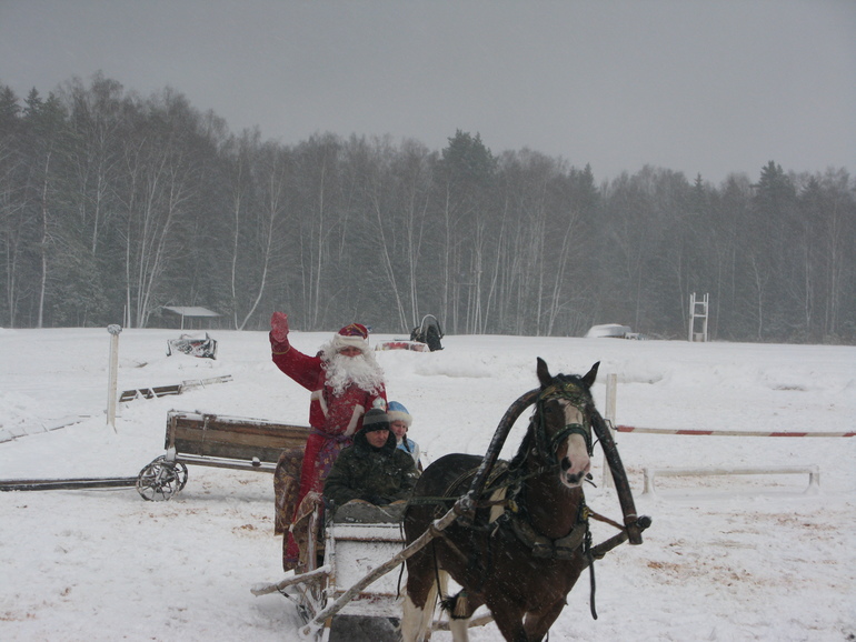 Сначала нам показали новогоднее представление с джигитовкой. Потом было поздравление от деда Мороза и Снегурочки.
