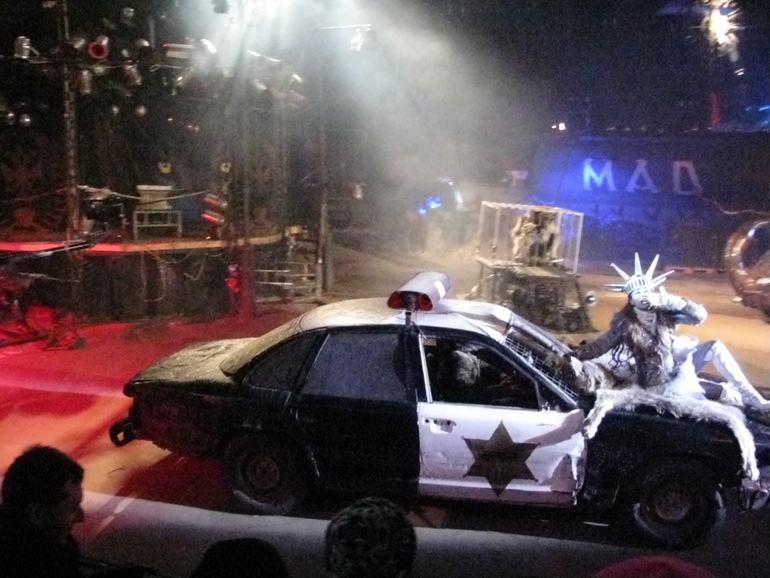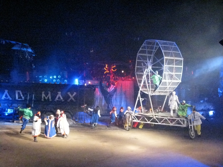 Шикарное зрелище, трюки, файер-шоу, русский рок. Умопомрачительные декорации, самые настоящие ночные волки.
