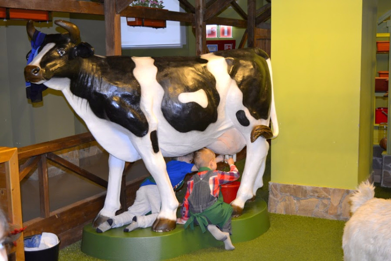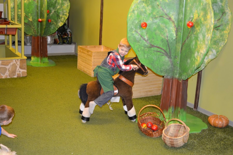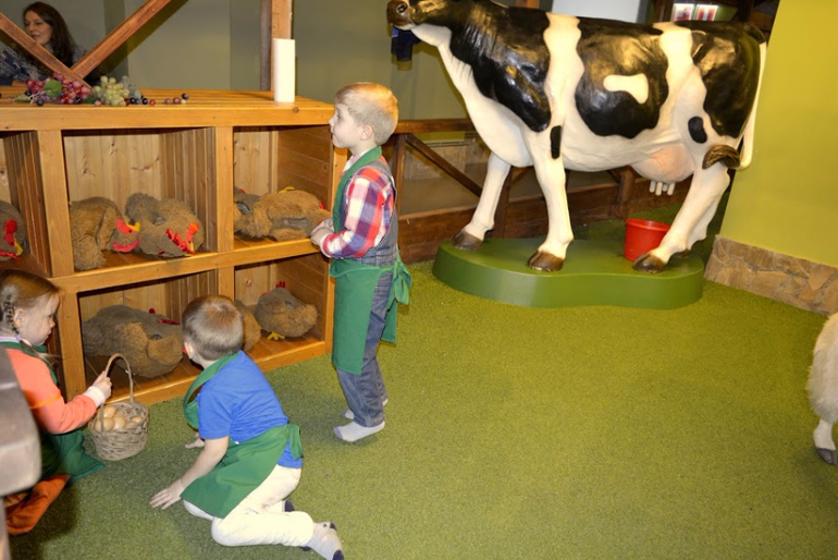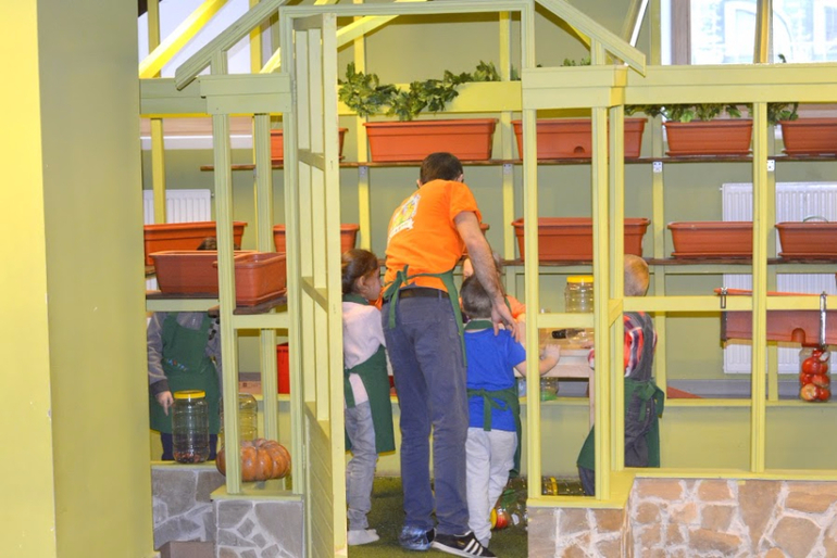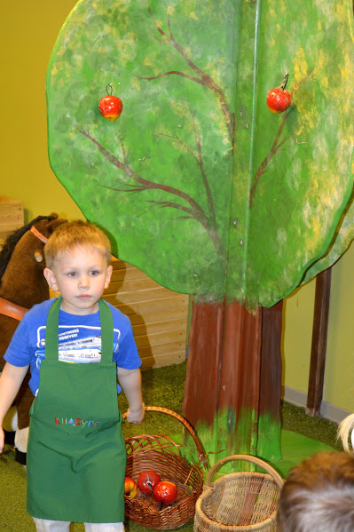 Затем Илюша работал на ферме. Детям показали как работать с растениями. Их отвели в импровизированную тепличку и там что-то рассказывали о посадке, пересадке растений и показывали. Потом дети собирали яблоки, кормили разную домашнюю птицу, доили корову.