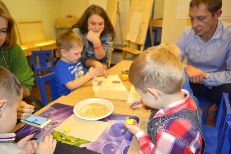 В финале Илюшиной профориентации мы посетили Школу Искусств. Такую бы школу, да себе домой))) Илья рисовал на песке, лепил из теста и делал папе поделку из картона со своим рисунком, теста и гороха.