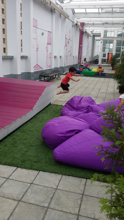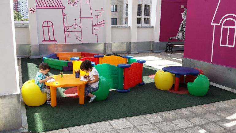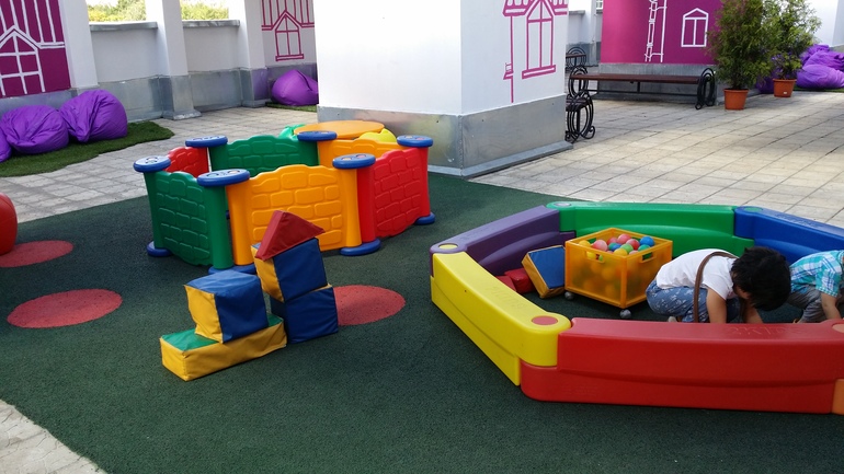 Для детей здесь весьма скромный набор развлечений: не очень много шариков для сухого бассейна, штук 10 фигурок крупного мягкого конструктора, 2 стола со стульями и карандаши.